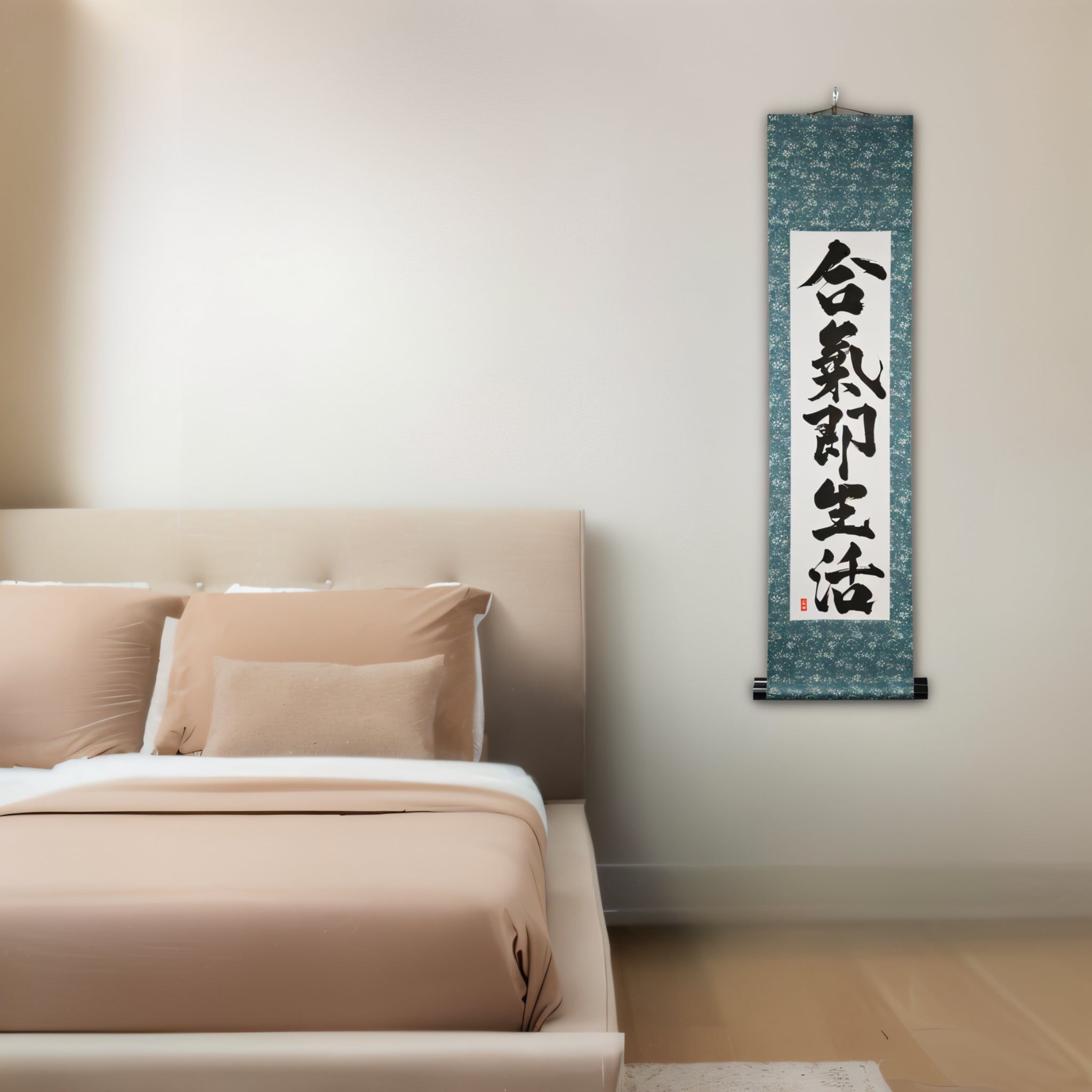 This Japanese calligraphy scroll features the profound phrase 合気即生活 (Aiki Soku Seikatsu) — "Aikido is daily life". It expresses a core principle of Aikido: the art is not confined to the dojo, but flows through every moment of our lives.