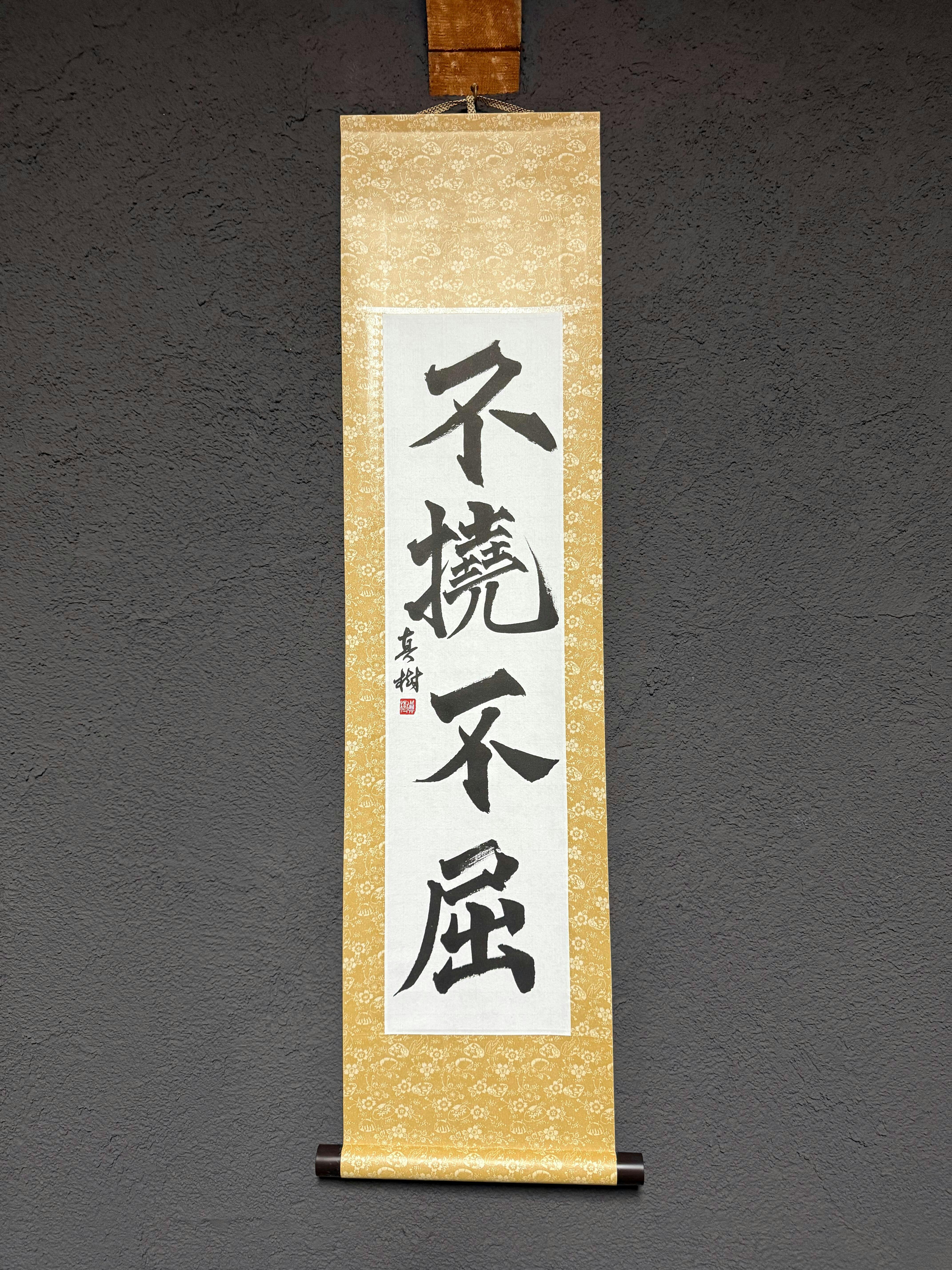 This Japanese calligraphy scroll features the bold phrase 不撓不屈 (Futō Fukutsu) — a powerful expression of the indomitable spirit that lies at the heart of Japanese martial arts and the Samurai code.