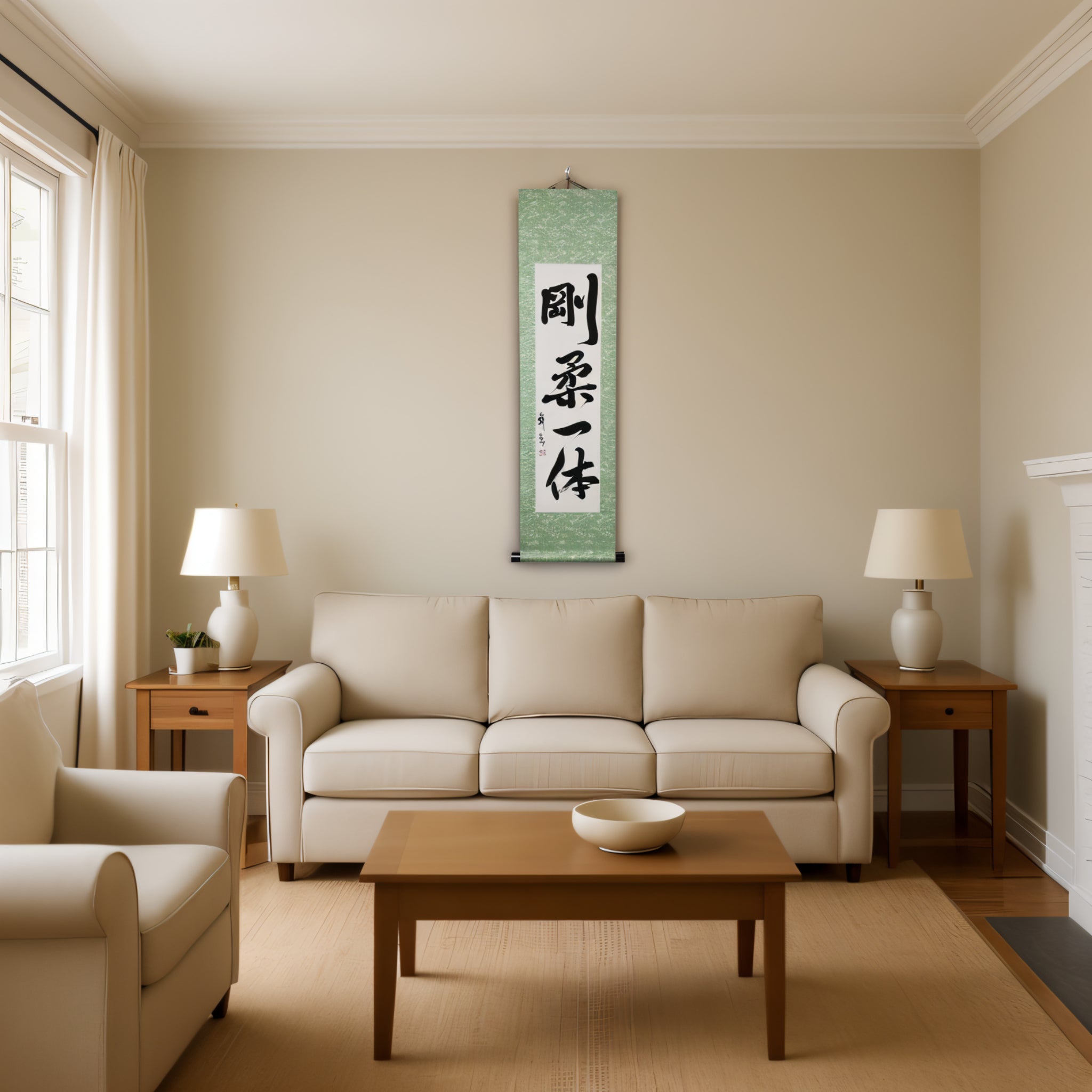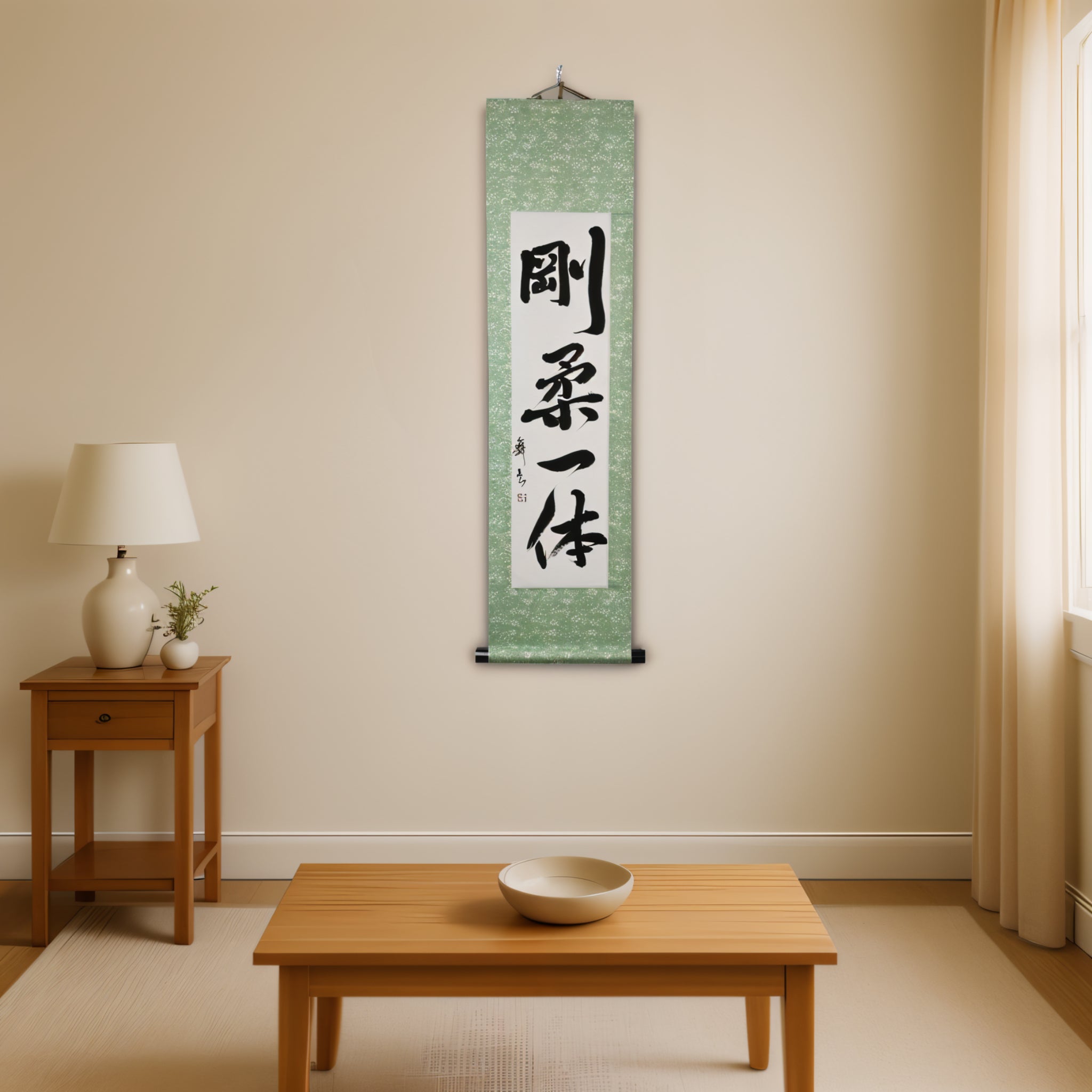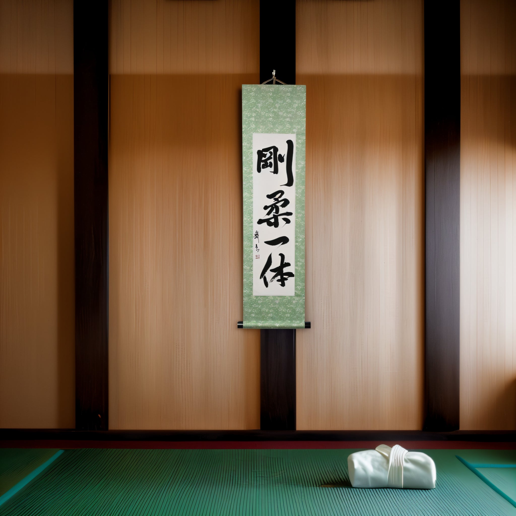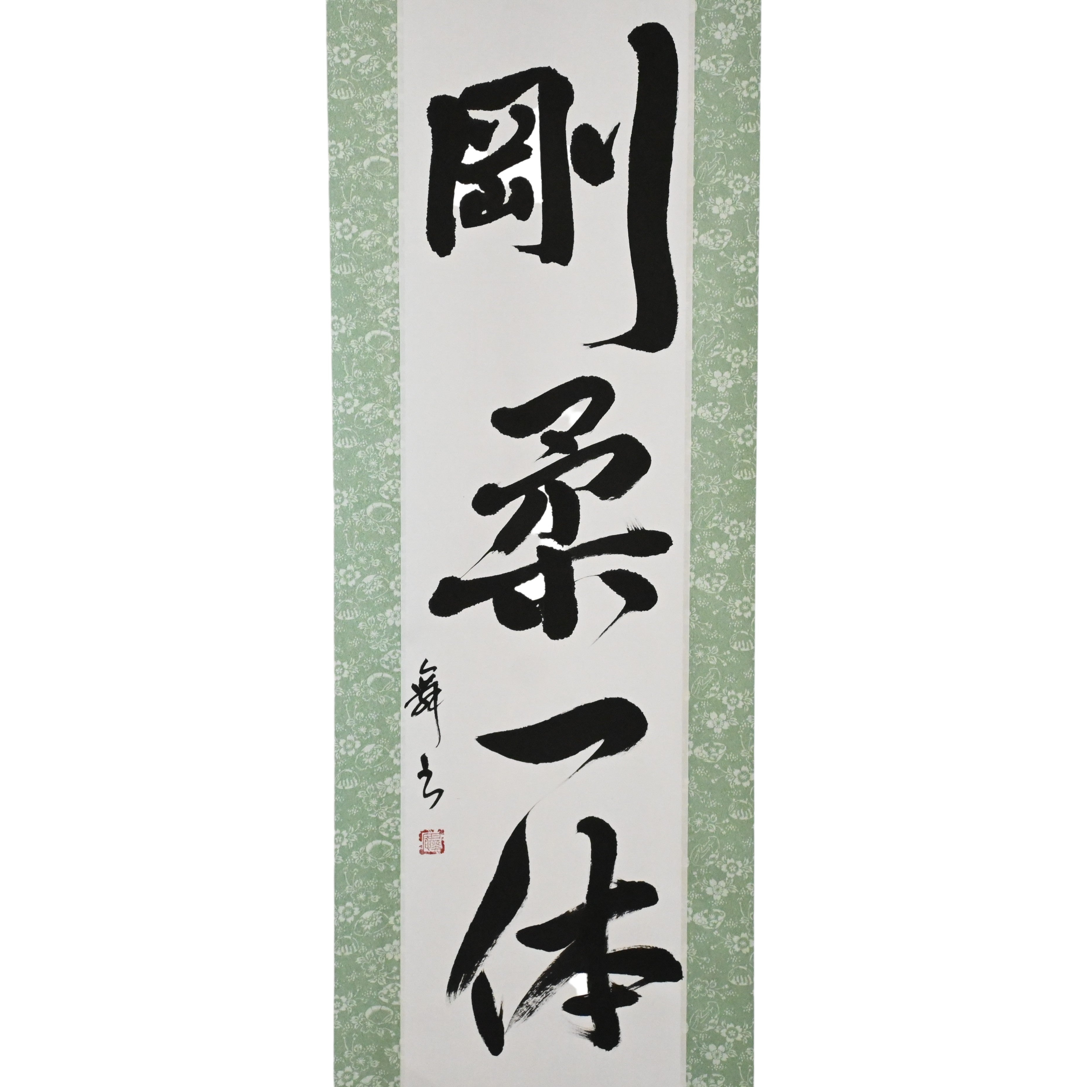 This Japanese calligraphy scroll features the phrase 剛柔一体 (Gōjū Ittai) — a profound concept that lies at the heart of Karate philosophy, especially in 剛柔流 (Gōjū-ryū), one of its most revered traditional styles.