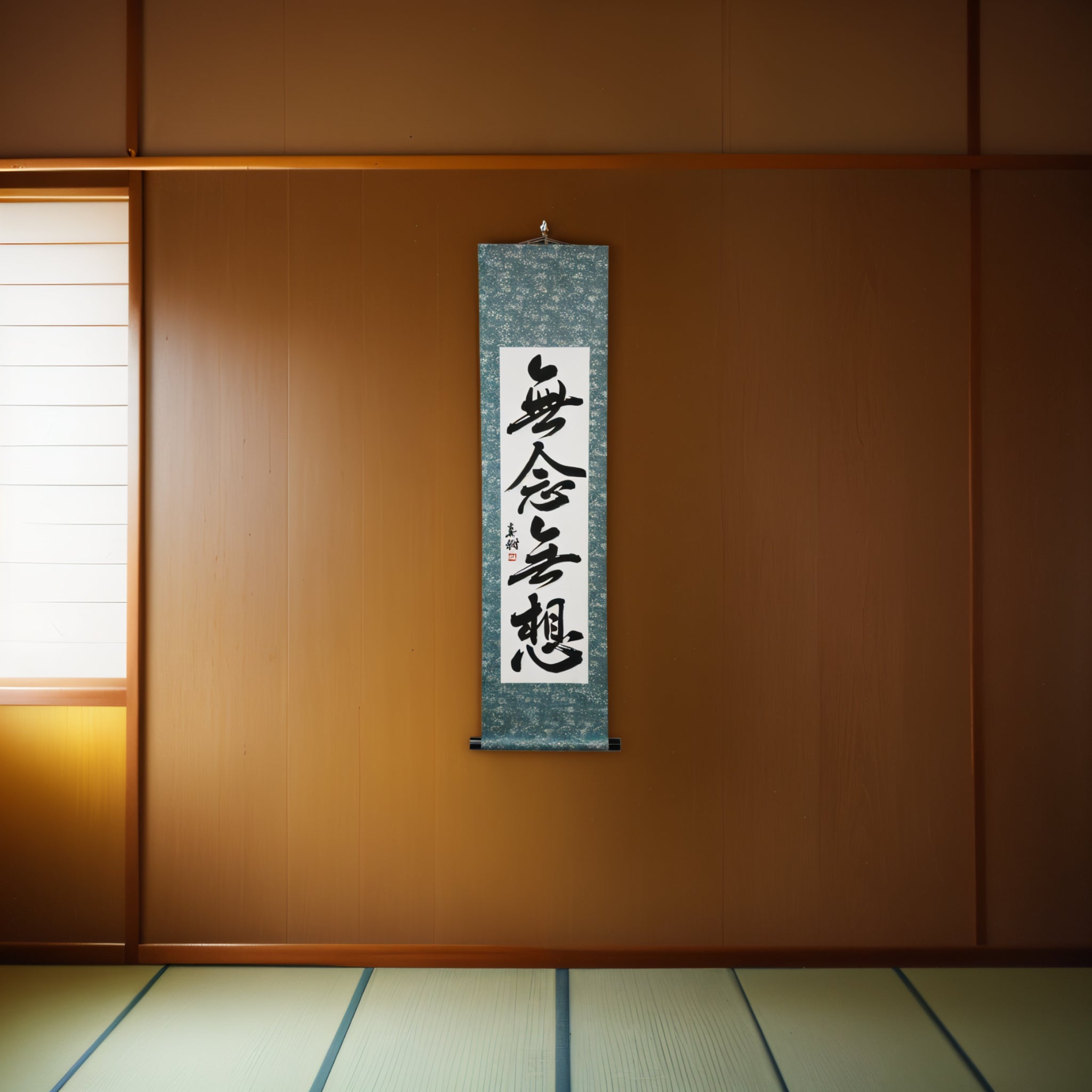This Japanese calligraphy scroll presents the profound 禅 (Zen) principle 無念無想 (Munen Musō) — a state of mind free from thought and distraction, fundamental to the Samurai’s way. Rooted in both 禅 (Zen) practice and 武士道 (Bushidō), 無念無想 allows the warrior to act with pure presence, responding intuitively and decisively in every moment.