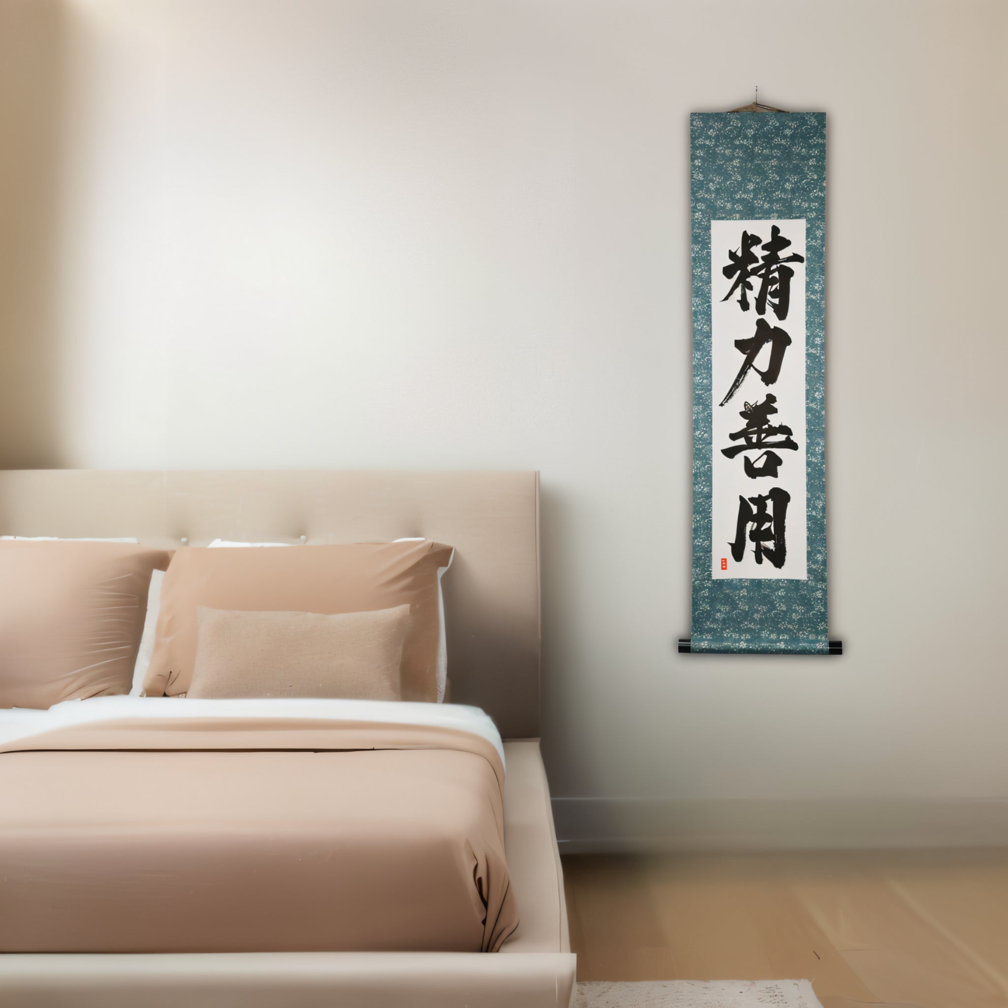 This Japanese calligraphy scroll features the timeless phrase 精力善用 (Seiryoku-Zenyō) — translated as "Maximum Efficient Use of Energy". It is one of the two core principles of Judo, alongside 自他共栄 (Jita-Kyōei, "Mutual Welfare and Benefit"), both established by Judo’s founder, Jigoro Kano (嘉納治五郎).