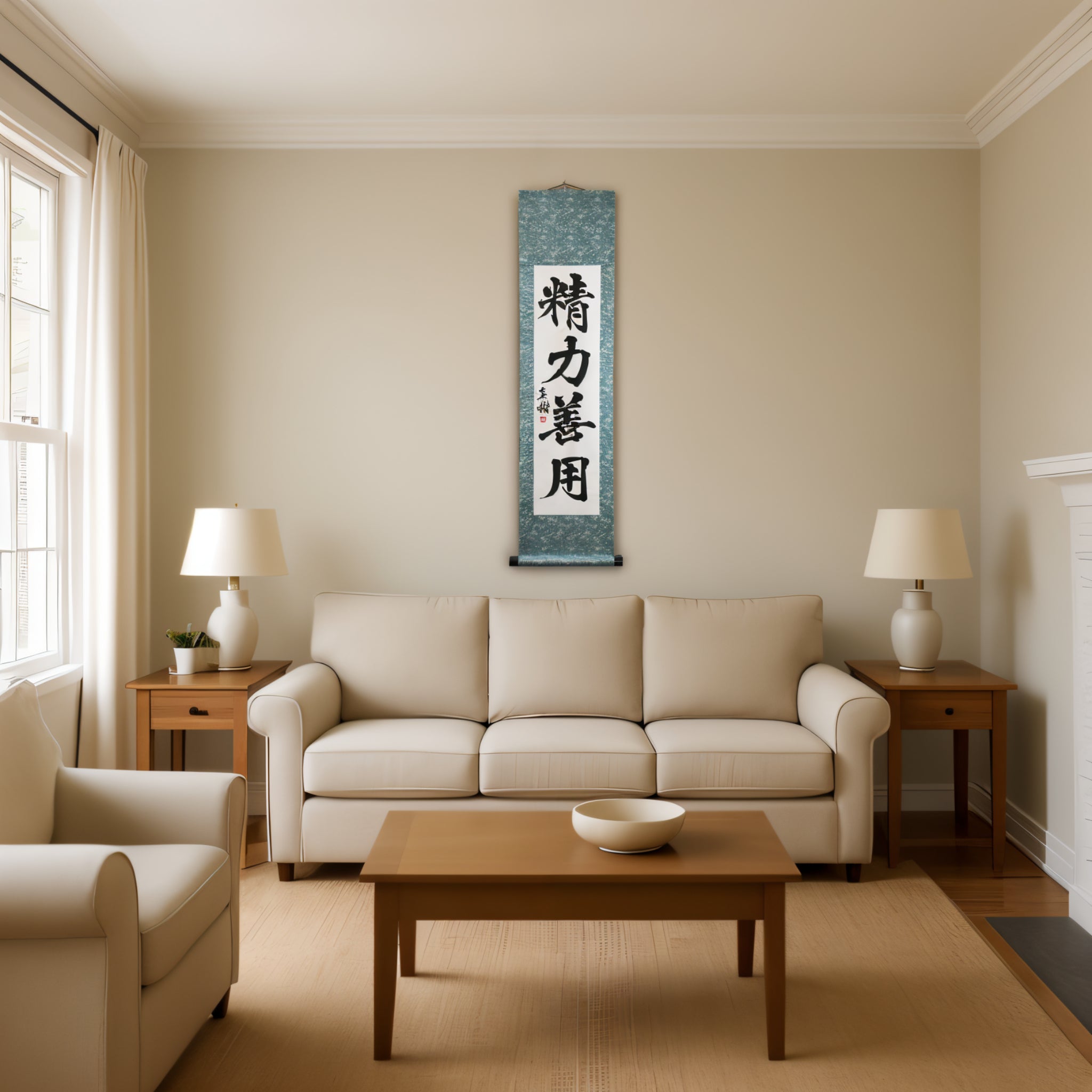 This Japanese calligraphy scroll features the timeless phrase 精力善用 (Seiryoku-Zenyō) — translated as "Maximum Efficient Use of Energy". It is one of the two core principles of Judo, alongside 自他共栄 (Jita-Kyōei, "Mutual Welfare and Benefit"), both established by Judo’s founder, Jigoro Kano (嘉納治五郎).