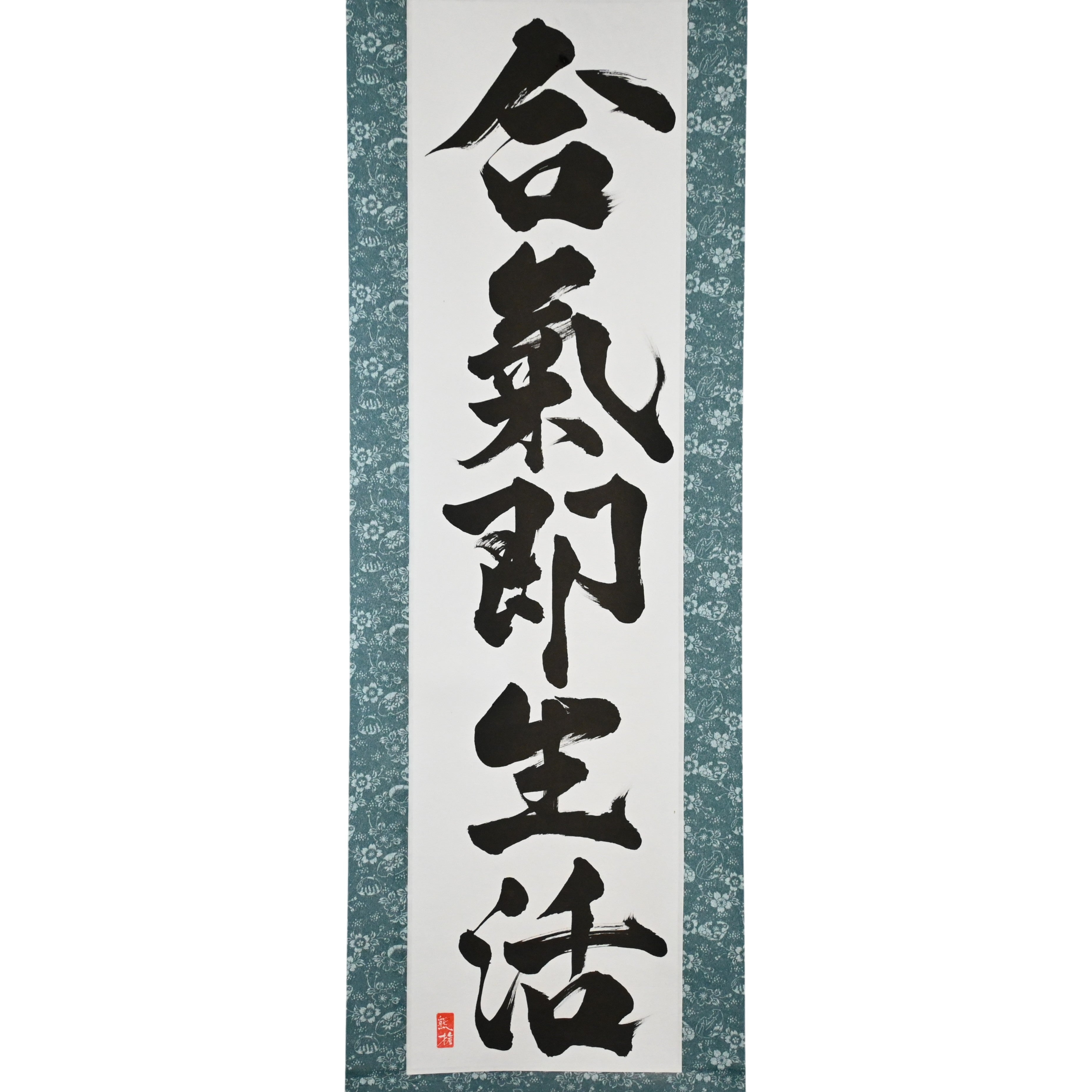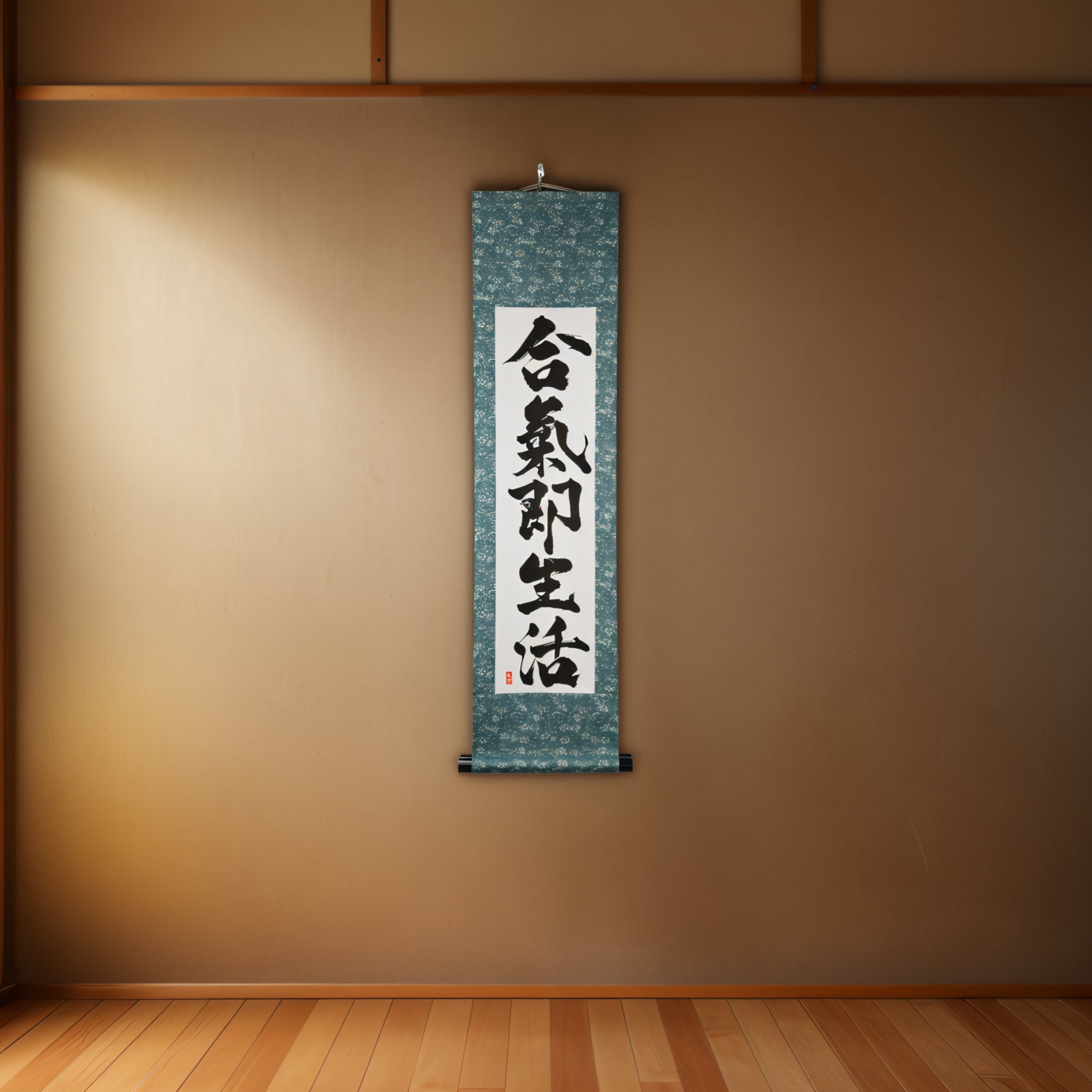 Este pergaminho de caligrafia japonesa apresenta a frase profunda 合気即生活 (Aiki Soku Seikatsu) — "Aikido é a vida diária". Ela expressa um princípio fundamental do Aikido: a arte não está confinada ao dojo, mas flui por cada momento de nossas vidas.