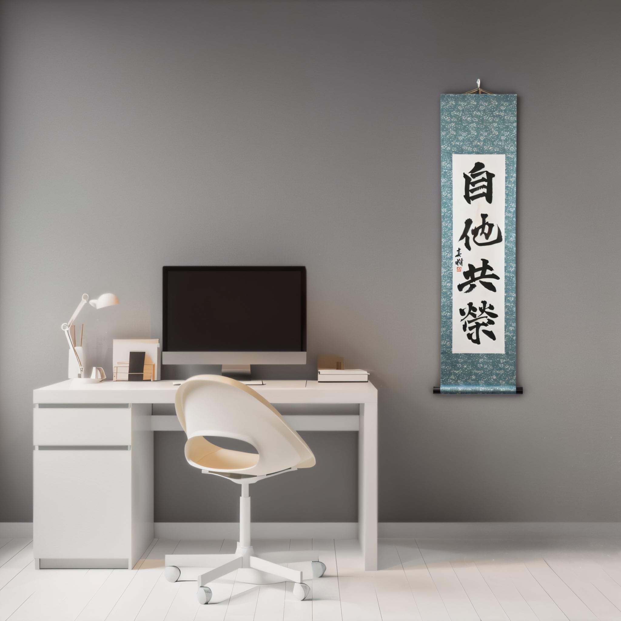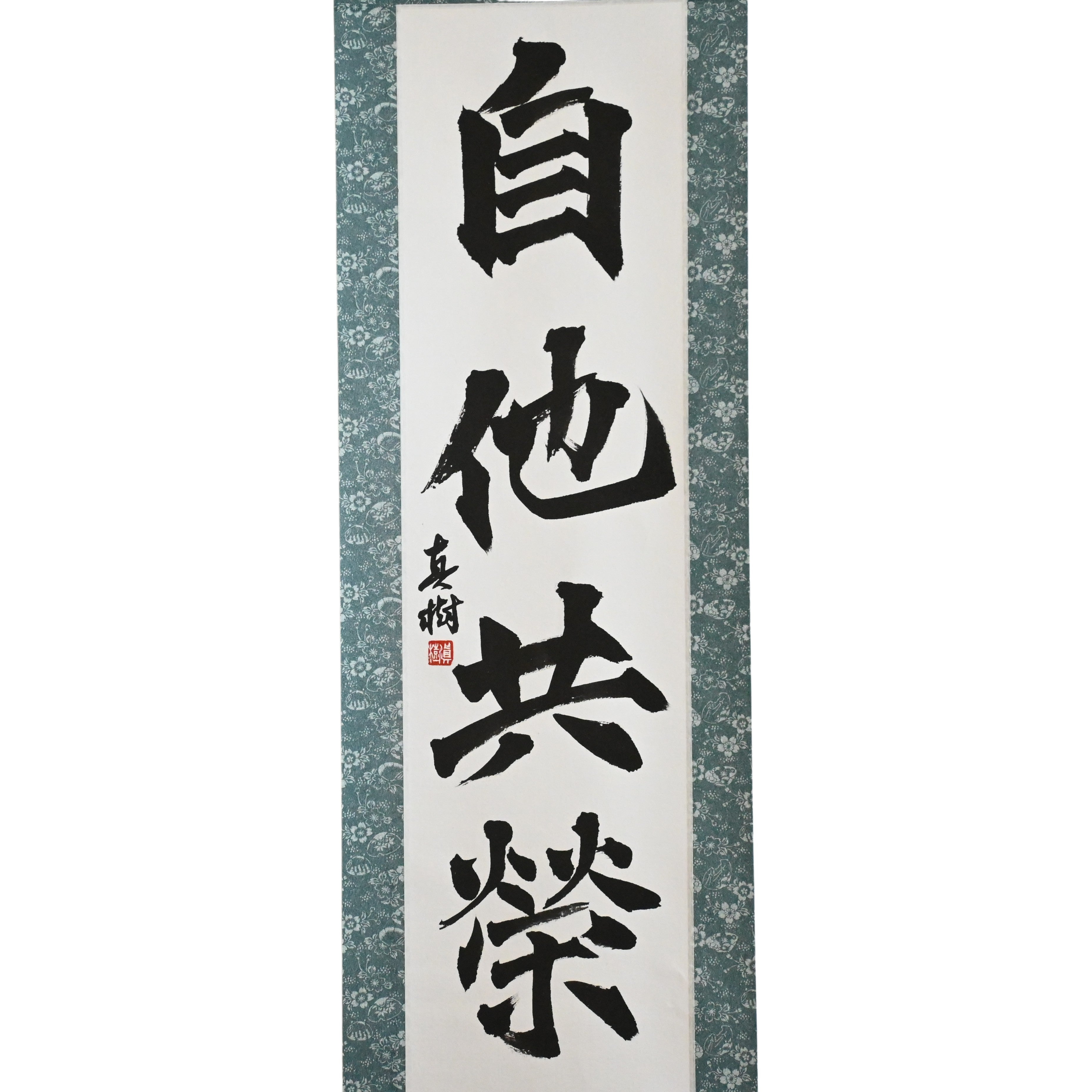 Este pergaminho de caligrafia japonesa apresenta a frase atemporal 自他共栄 (Jita-Kyōei) — traduzida como "Bem-Estar e Benefício Mútuo". É um dos dois princípios fundamentais do Judô, junto com 精力善用 (Seiryoku-Zenyō, "Uso Máximo e Eficiente da Energia"), ambos estabelecidos pelo fundador do Judô, Jigoro Kano (嘉納治五郎).
