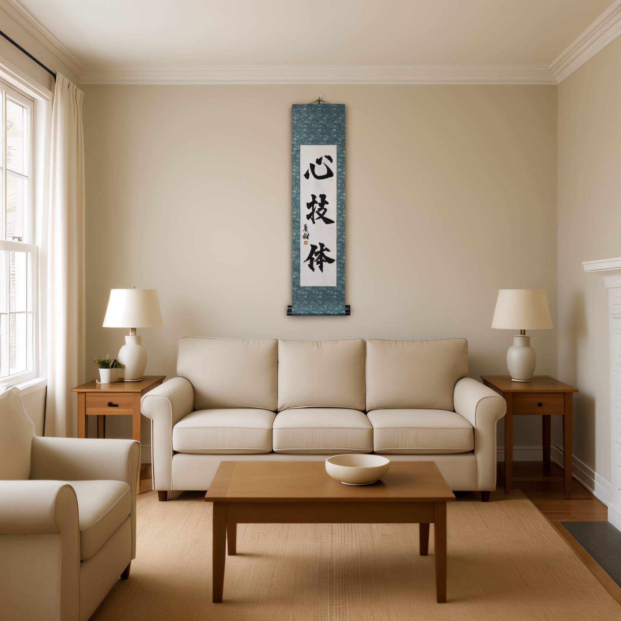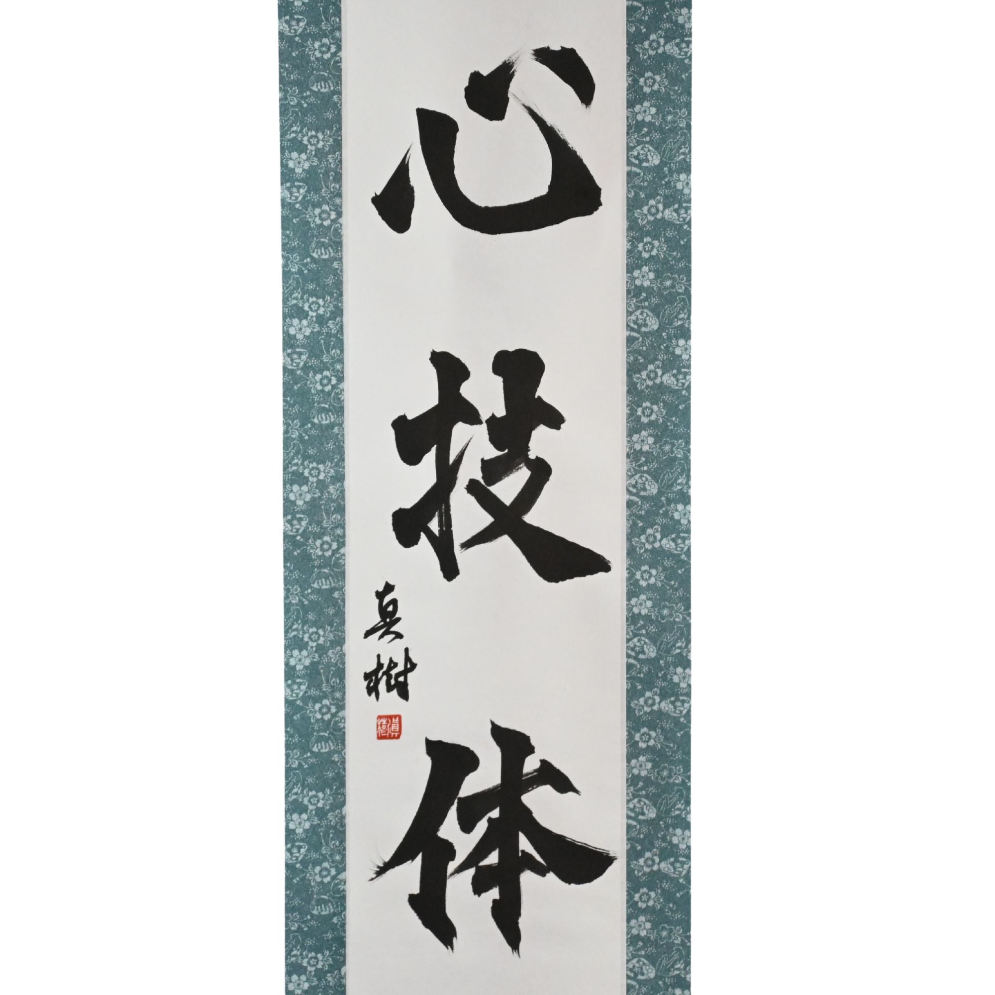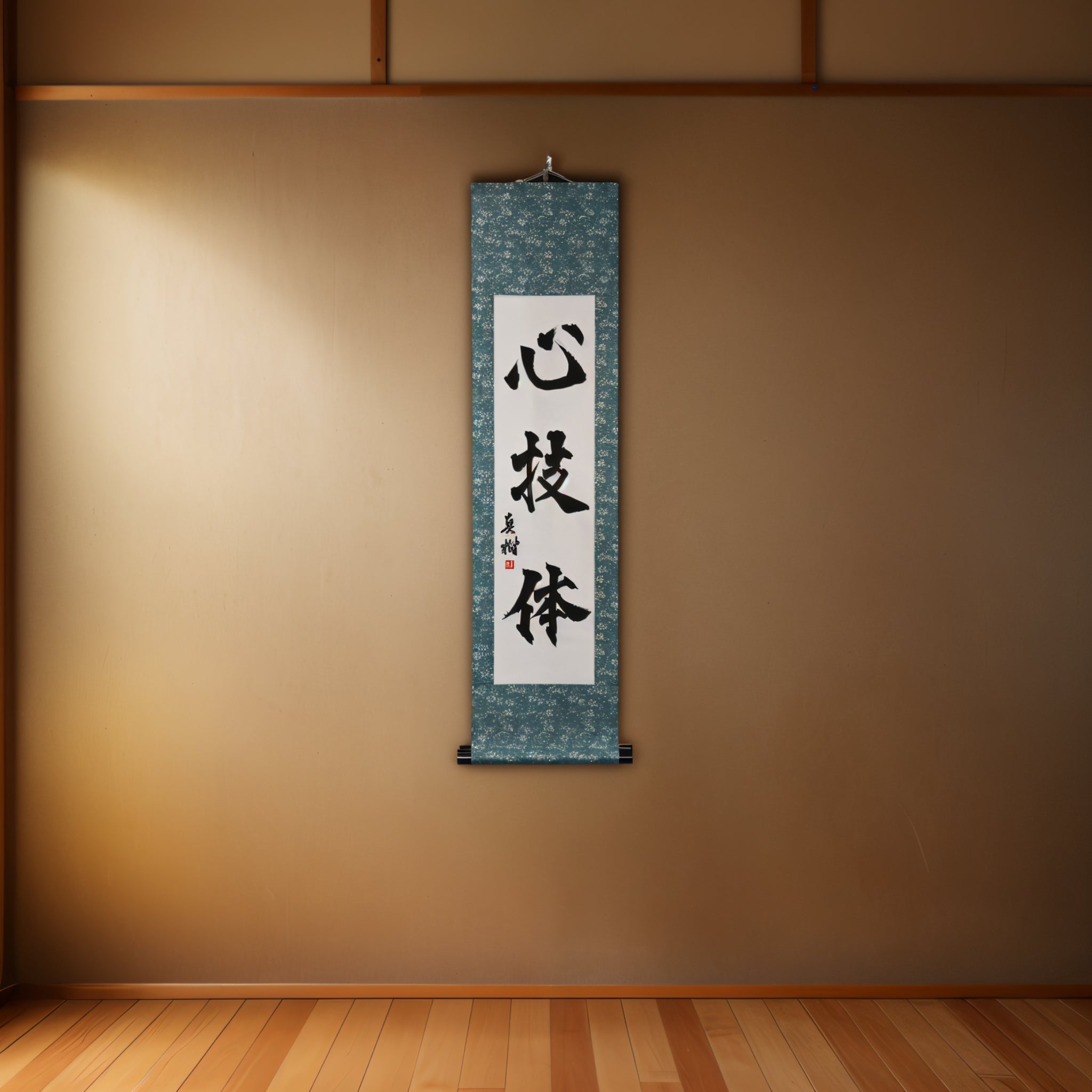 Este pergaminho de caligrafia japonesa apresenta a frase reverenciada 心技体 (Shingitai) — o conceito fundamental por trás de todas as artes marciais tradicionais japonesas, incluindo Judô, Karatê, Aikido e mais.