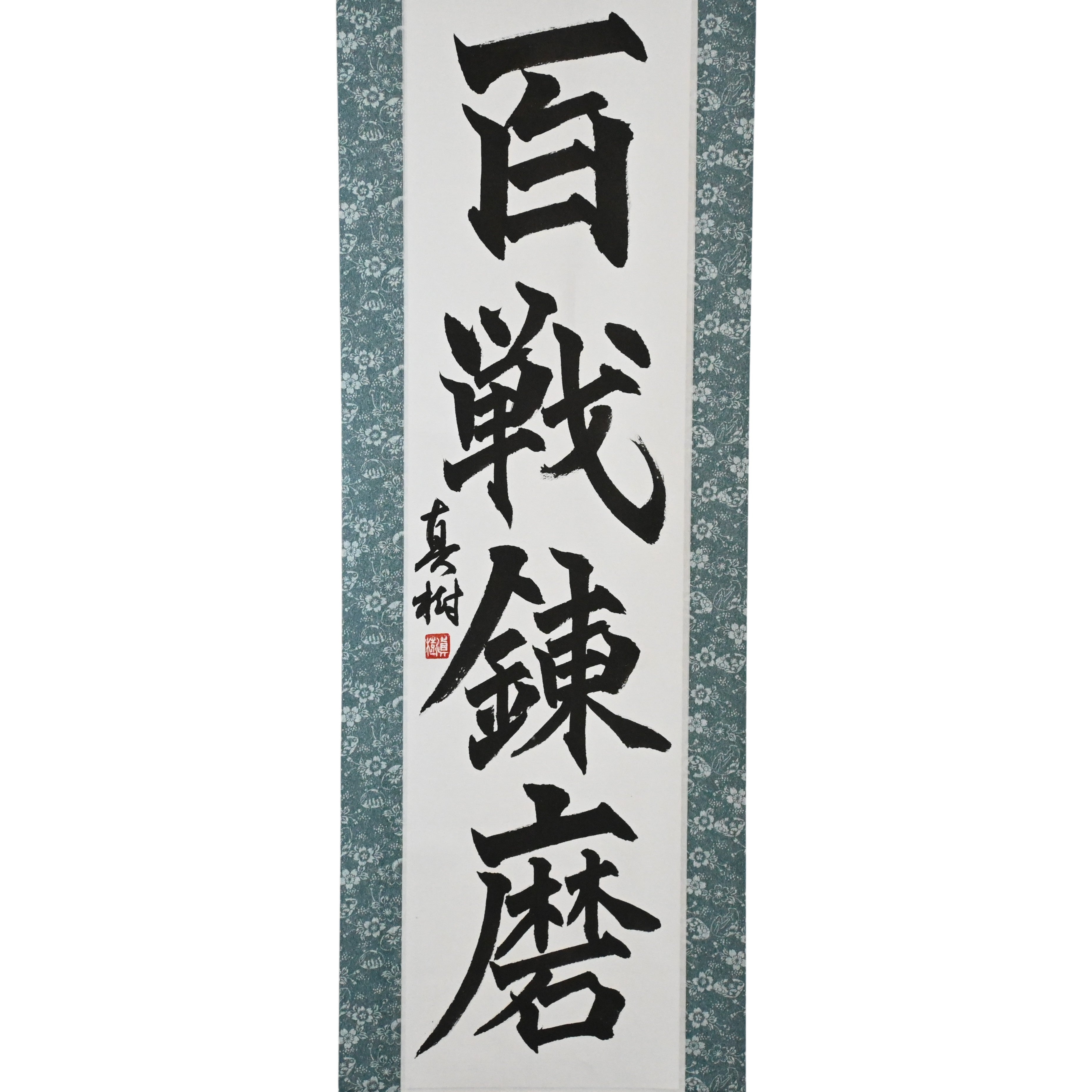 Honre um ditado japonês atemporal com este pergaminho de caligrafia dinâmico apresentando 百戦錬磨 (Hyakusen Renma) — uma expressão poderosa que incorpora o espírito samurai de força, resiliência e domínio adquirido ao enfrentar inúmeros desafios.