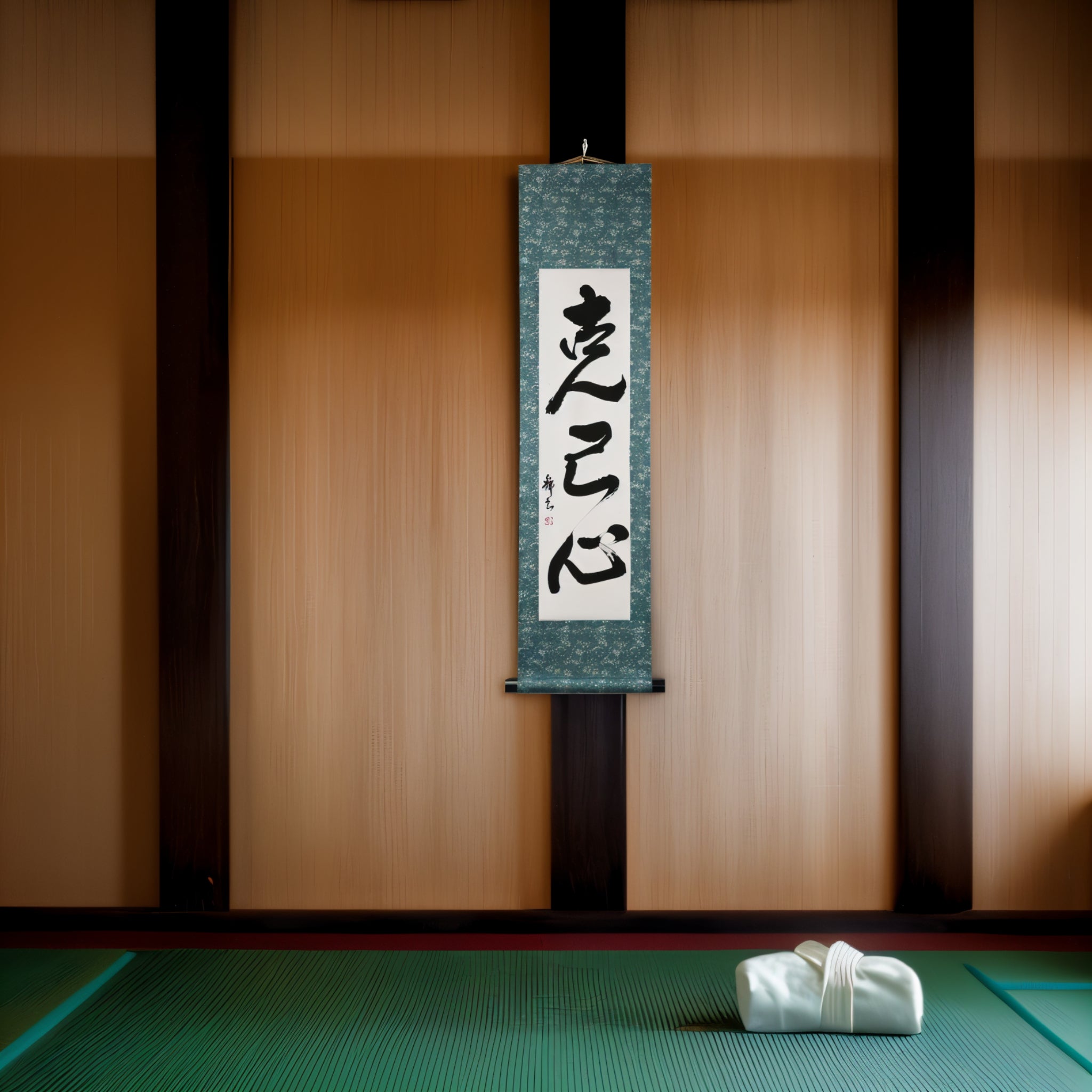 Este pergaminho de caligrafia japonesa apresenta o poderoso termo 克己心 (Kokkishin), que significa "o espírito do domínio próprio". Representa um princípio universal no Karate, Judo e Aikido — a ideia de que o maior adversário muitas vezes está dentro de si.