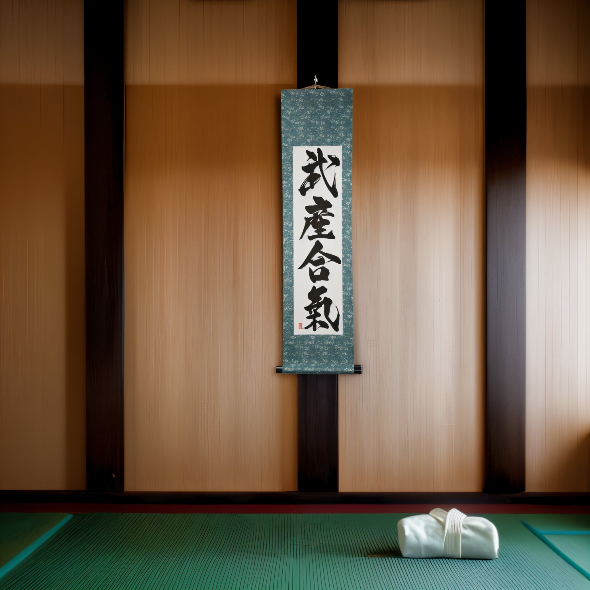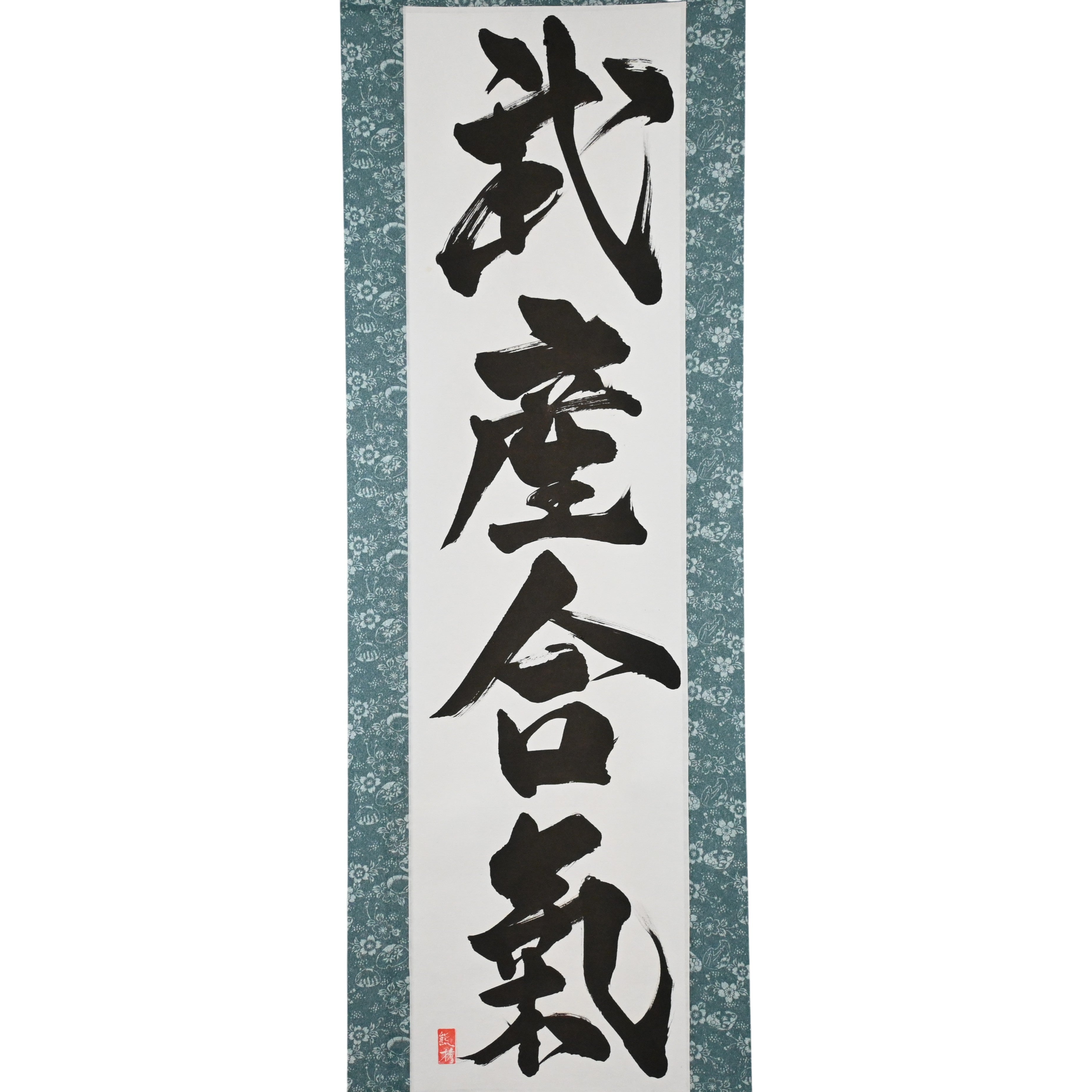 Este pergaminho de caligrafia japonesa apresenta a frase profundamente espiritual 武産合気 (Takemusu Aiki) — “o nascimento marcial da harmonia”. Uma expressão central do fundador do Aikido, Morihei Ueshiba (植芝盛平), ela encapsula a mais alta realização da arte.