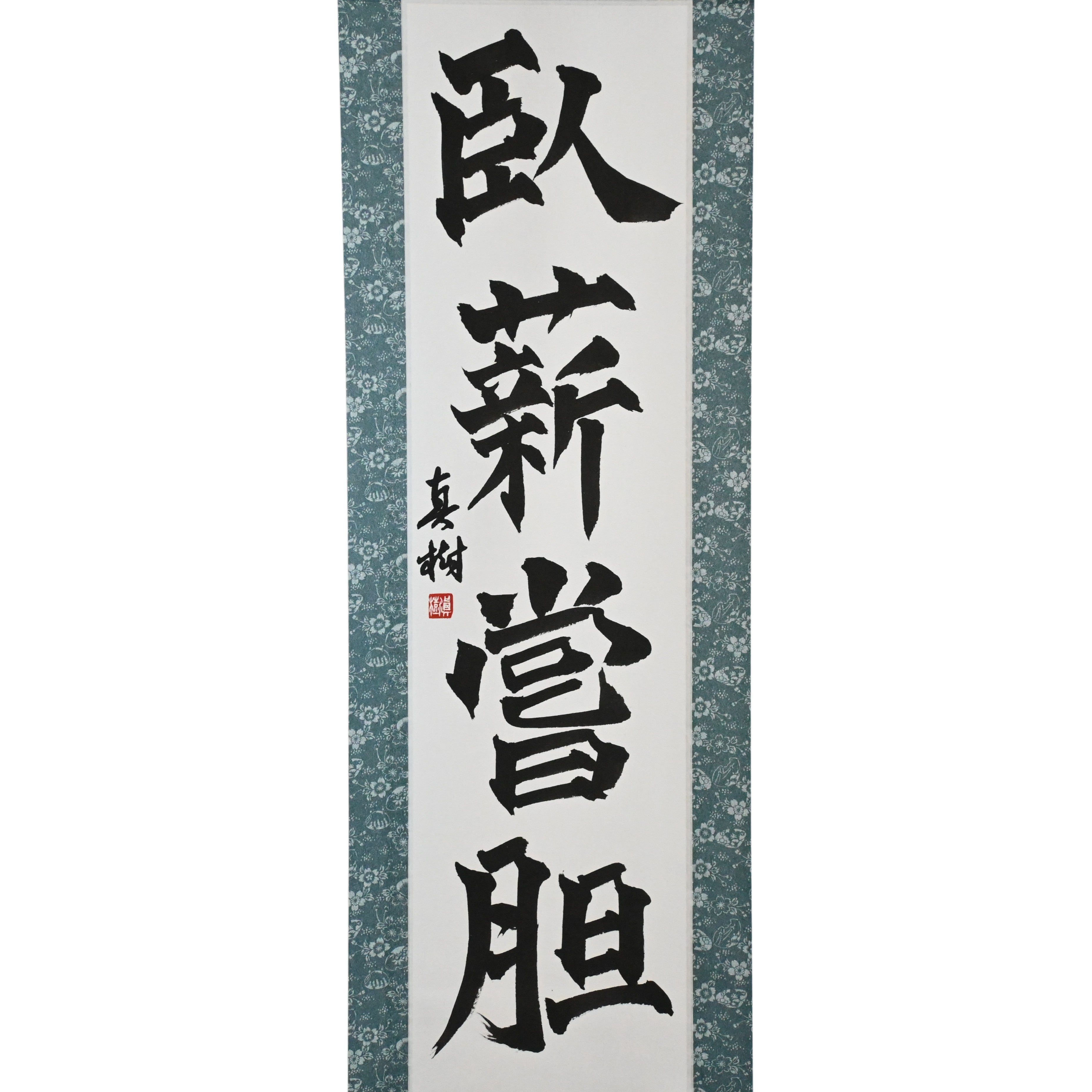 Este pergaminho de caligrafia japonesa apresenta a poderosa frase 臥薪嘗胆 (Gashin Shōtan) — uma expressão atemporal de paciência, perseverança e determinação silenciosa no caminho do samurai.