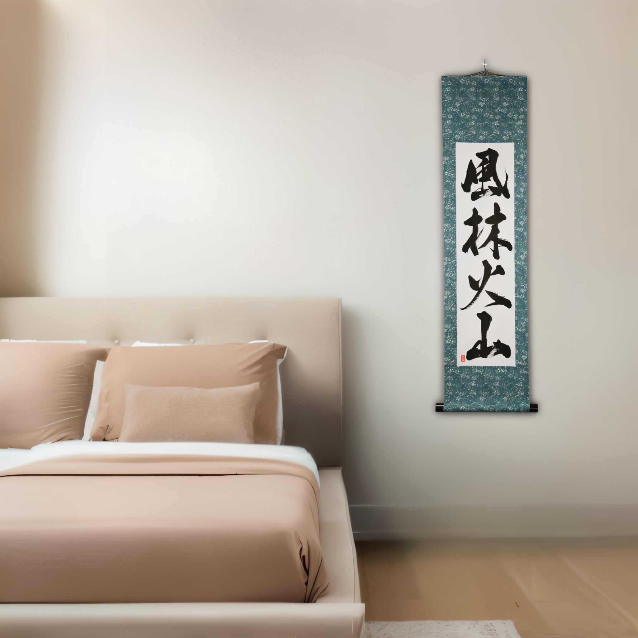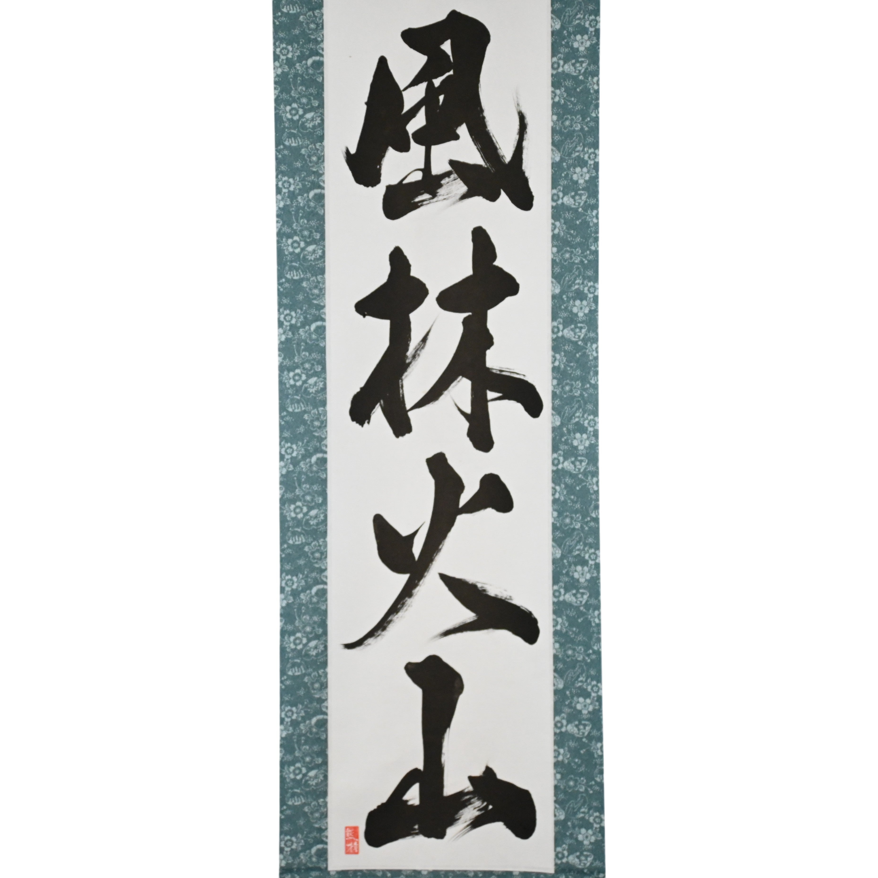 Descubra o espírito audacioso do Samurai com este poderoso pergaminho de caligrafia japonesa apresentando 風林火山 (Fūrinkazan) — uma frase lendária imortalizada pelo grande senhor da guerra Takeda Shingen (武田信玄), uma das figuras mais icônicas do Japão da era Sengoku (século XVI).