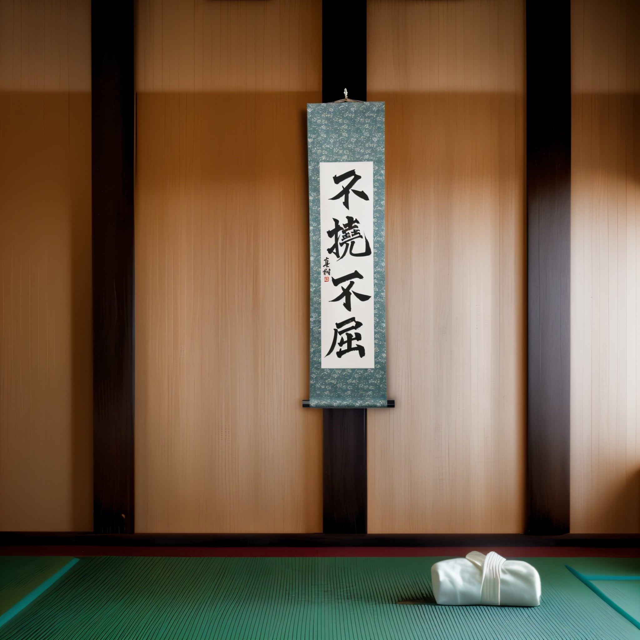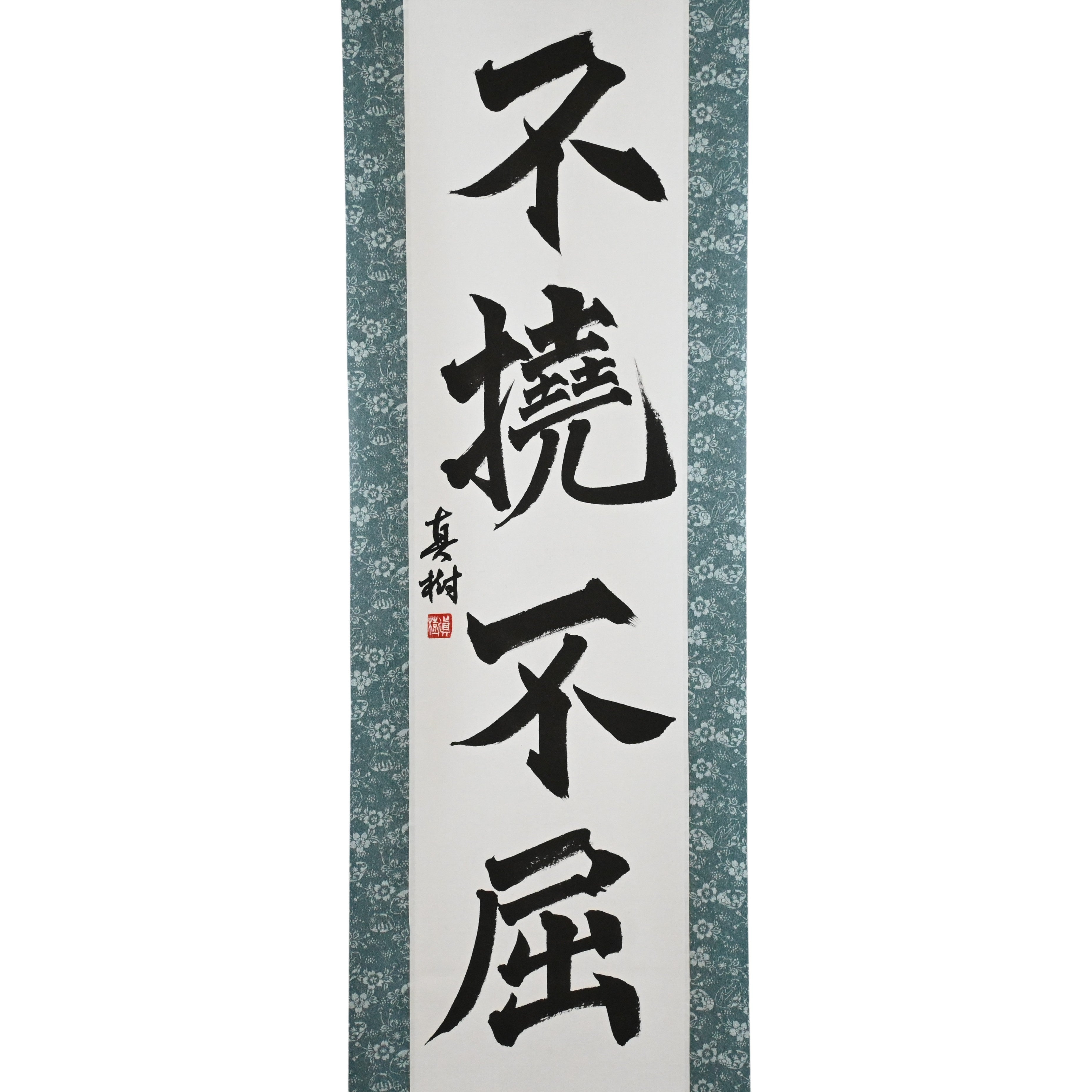 Este pergaminho de caligrafia japonesa apresenta a frase ousada 不撓不屈 (Futō Fukutsu) — uma expressão poderosa do espírito indomável que está no coração das artes marciais japonesas e do código Samurai.