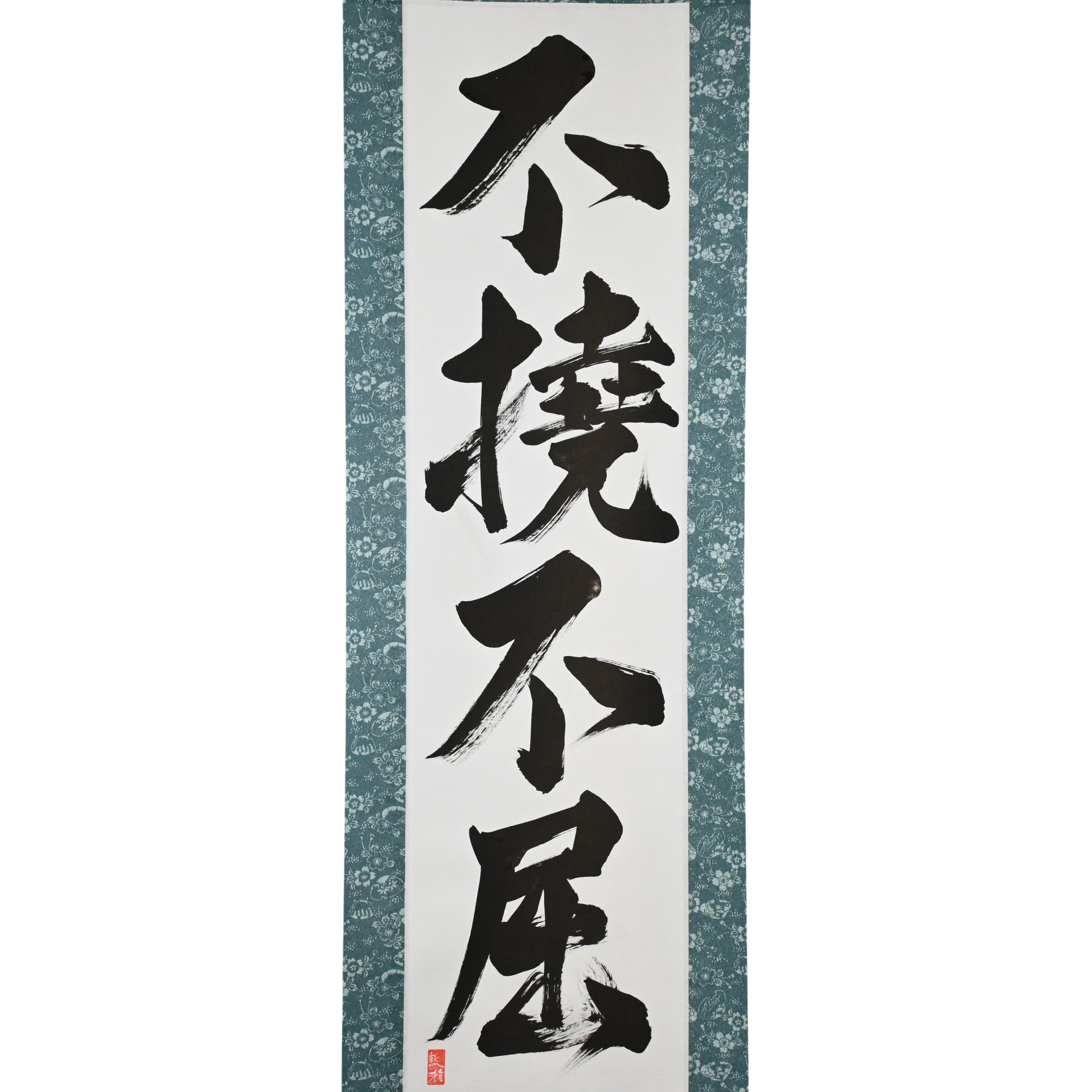 Este pergaminho de caligrafia japonesa apresenta a frase ousada 不撓不屈 (Futō Fukutsu) — uma expressão poderosa do espírito indomável que está no coração das artes marciais japonesas e do código Samurai.